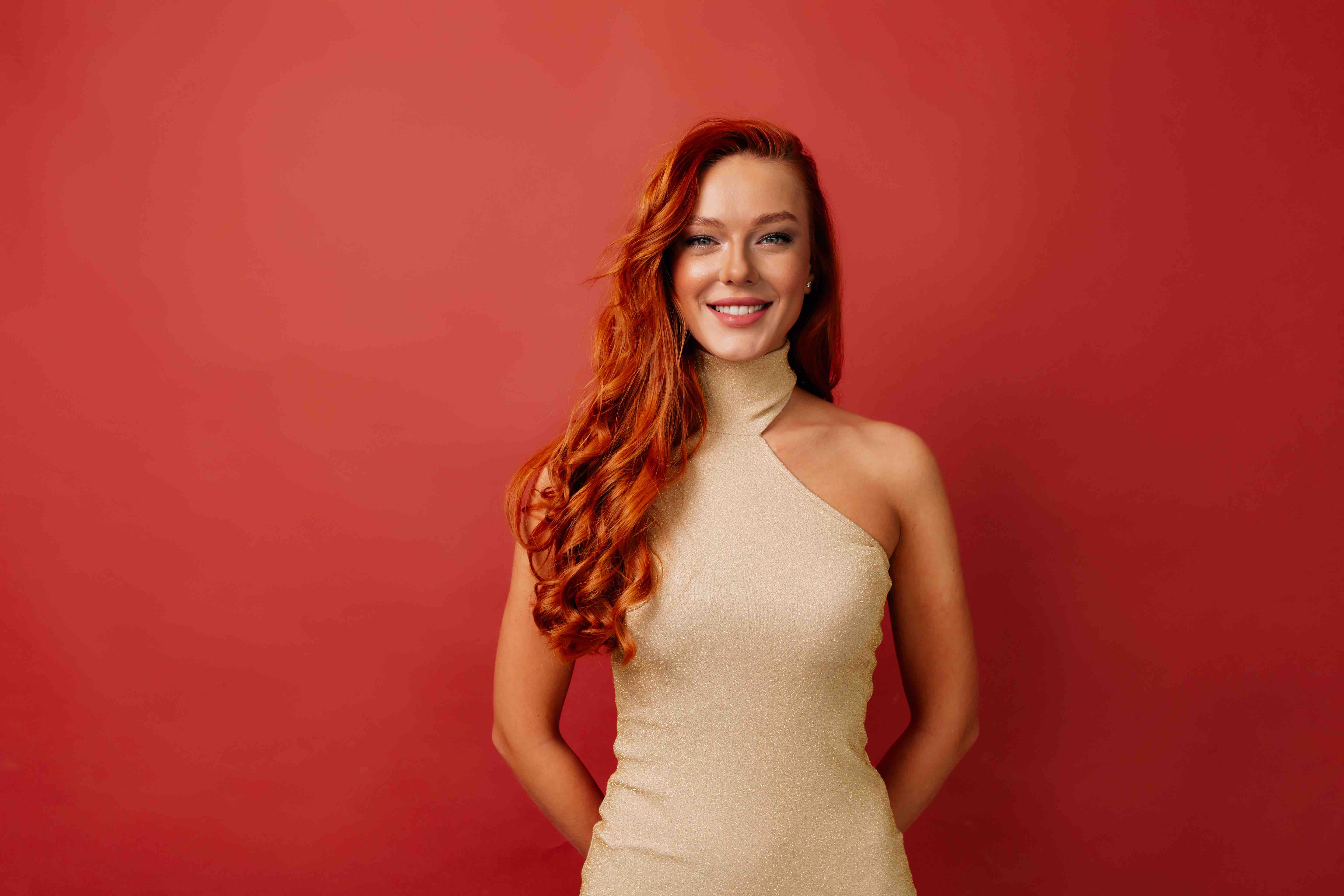 Close-up portrait of young stylish woman in red beret and top. Blue-eyed girl dreamily touches her red curls on pink background. Close-up portrait of young stylish woman in red beret and top. Blue-eyed girl dreamily touches her red curls on pink background